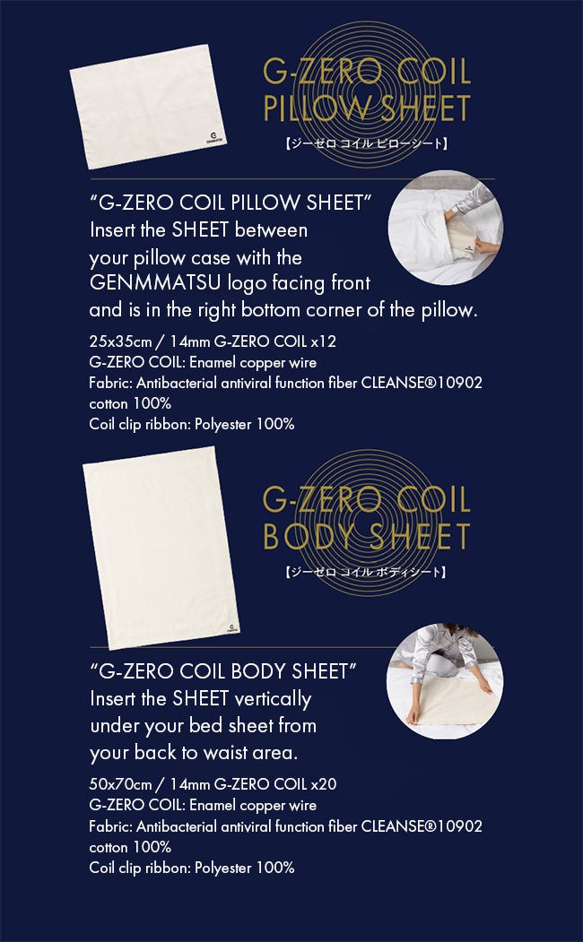 “G-ZERO COIL SHEET SERIES” G-ZERO COIL’s weak current will balance your ions and promote body’s blood flow.G-ZERO COIL’s weak current from the “G-ZERO COIL SHEET SERIES” not only normalizes the bioelectric current, but also stabilizes the capillaries. It supports the condition of one’s body by increasing the blood flow and improve the quality of sleep.